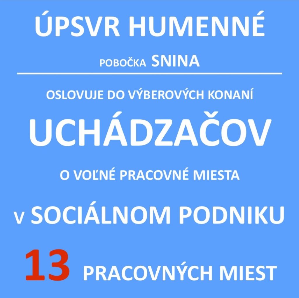 MESTSKÝ PODNIK SNINA, s.r.o. v spolupráci s ÚRADOM PRÁCE, SOCIÁLNYCH VECÍ A RODINY (ÚPSVR) V SNINE uskutoční v dňoch 18. a 20.septembra 2019 výberové konania na voľné pracovné pozície v sociálnom podniku - Mestský podnik Snina, s.r.o.