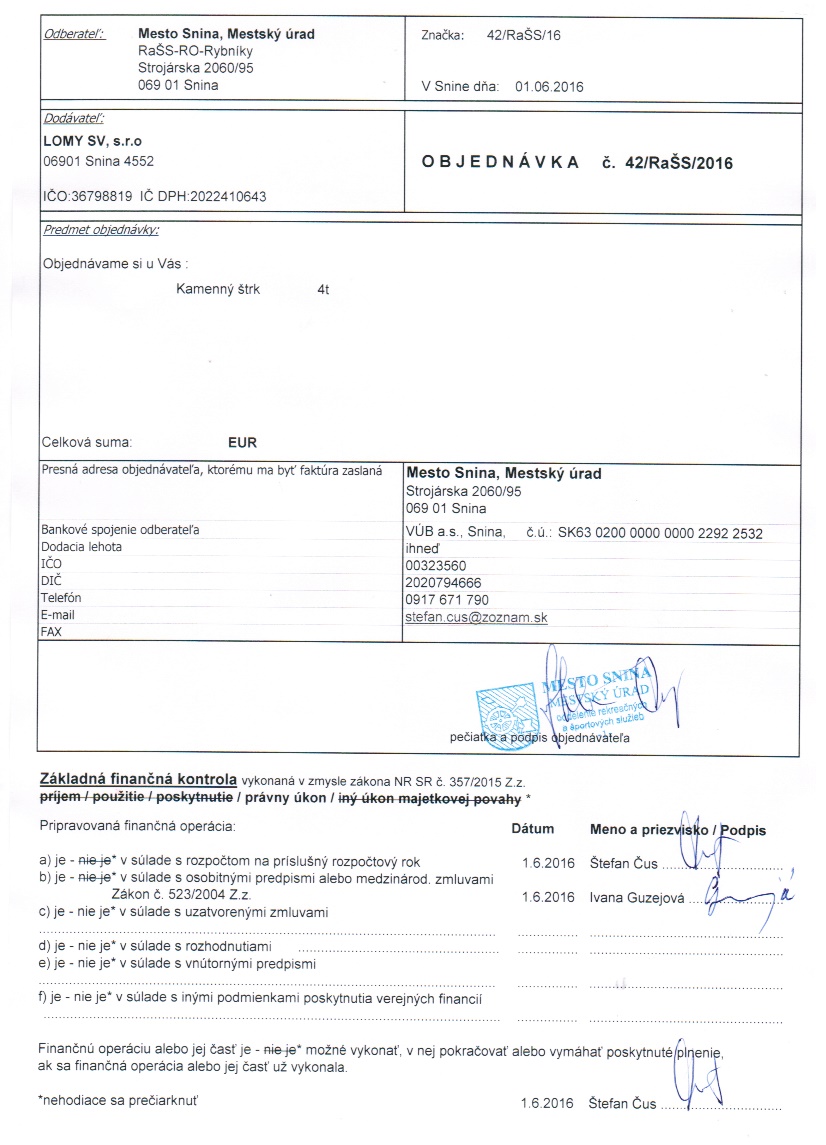 Mesto Snina, RaŠS-RO, Strojárska 2060, 06901 Snina