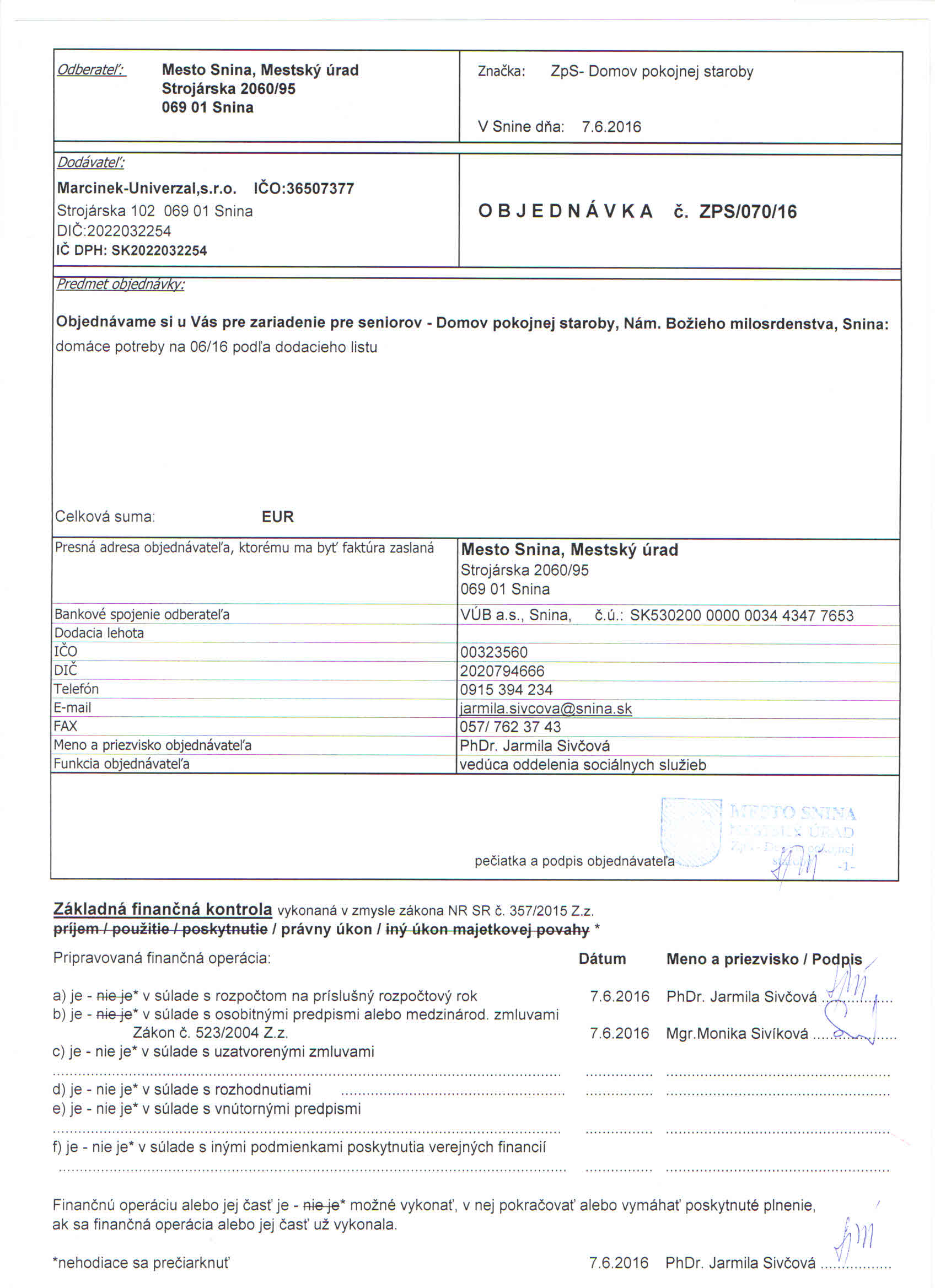 Mesto Snina, Mestský úrad, Strojárska 2060/95, 069 01, Snina