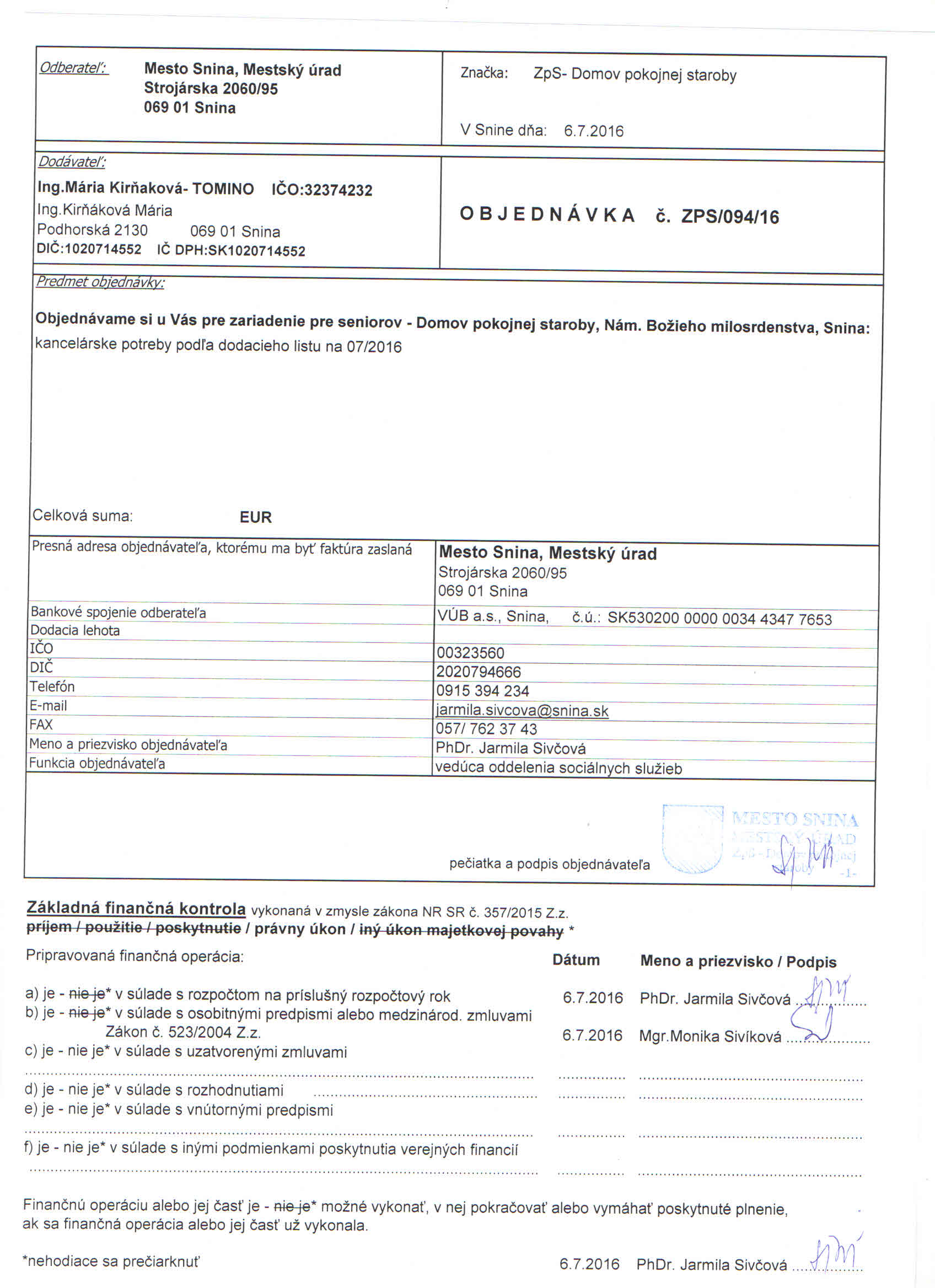 Detail objednávkyč.: ZPS/094/16