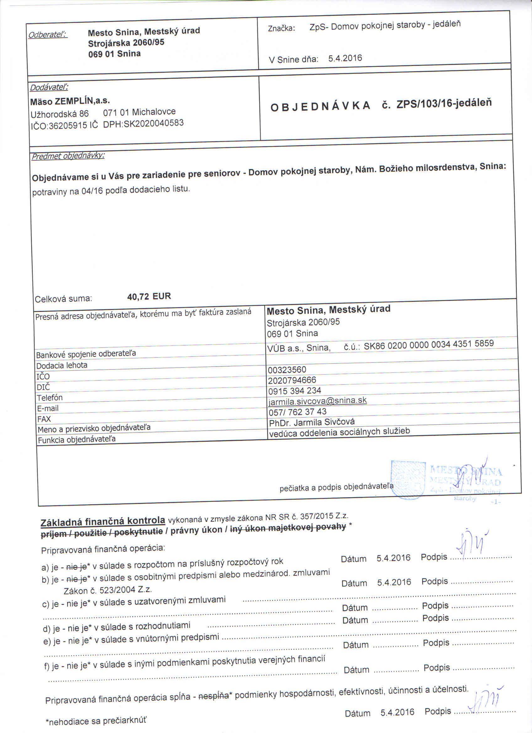 Detail objednávkyč.: ZPS/103/16-jedáleň